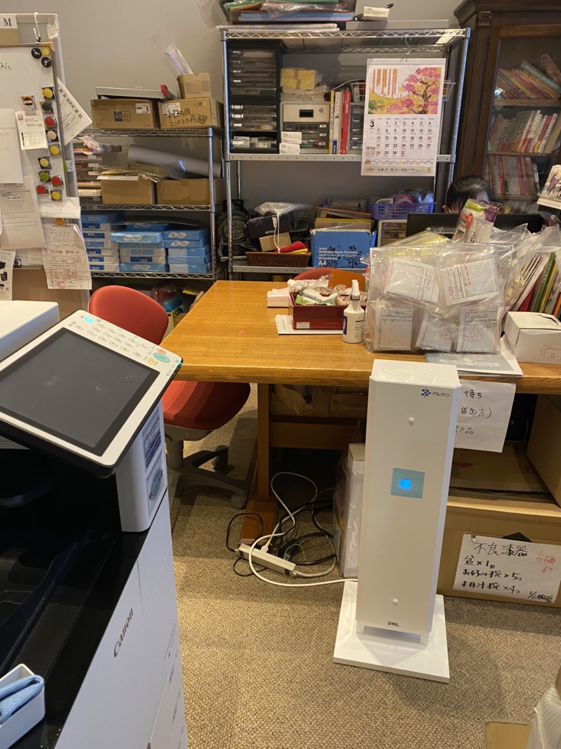 お客様の電話対応や、発送業務、打ち合わせや、コパ先生のサインを行っていただくなど、どうしても人が多くなってしまいます。コロナ対策はしっかりと行っていますが、換気だけでは心配な場面もありました。私たちが元気でいないと、コパ先生にも感染を広げてしまうリスクがあるので、紫外線を使った対策機器を導入していただき感謝しています。部屋の窓から1番遠い、空気が循環しにくい場所に置くようにアドバイスされそのようにしております。心なしか少し事務所の空気が臭いと雰囲気ともに良くなった気がします。退社時はタイマーをセットして電源にも注意しています。やはり安心感がありますね。
