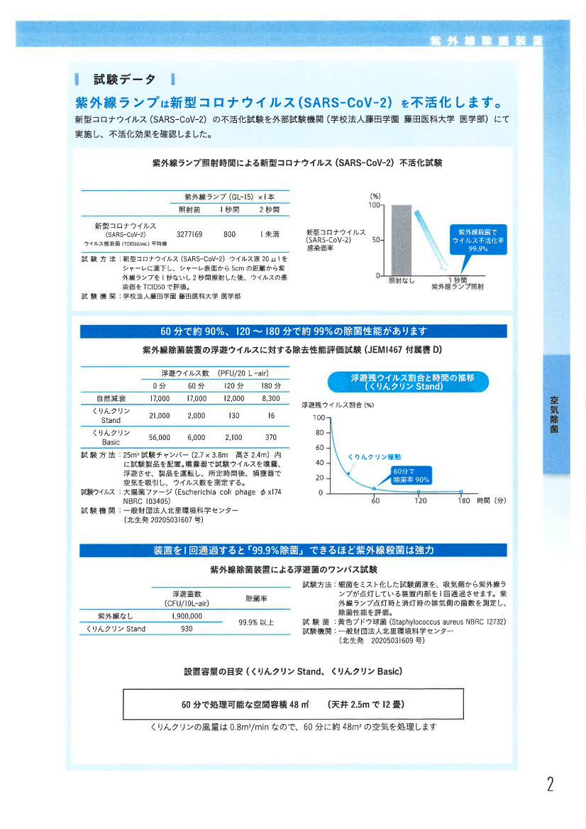 学校法人藤田学園 藤田医科大学にて、本装置で利用している紫外線ランプを用いた新型コロナウイルス(SARS-CoV-2)の不活性化試験を行い、新型コロナウイルスの不活性化を確認しております。[実験結果]